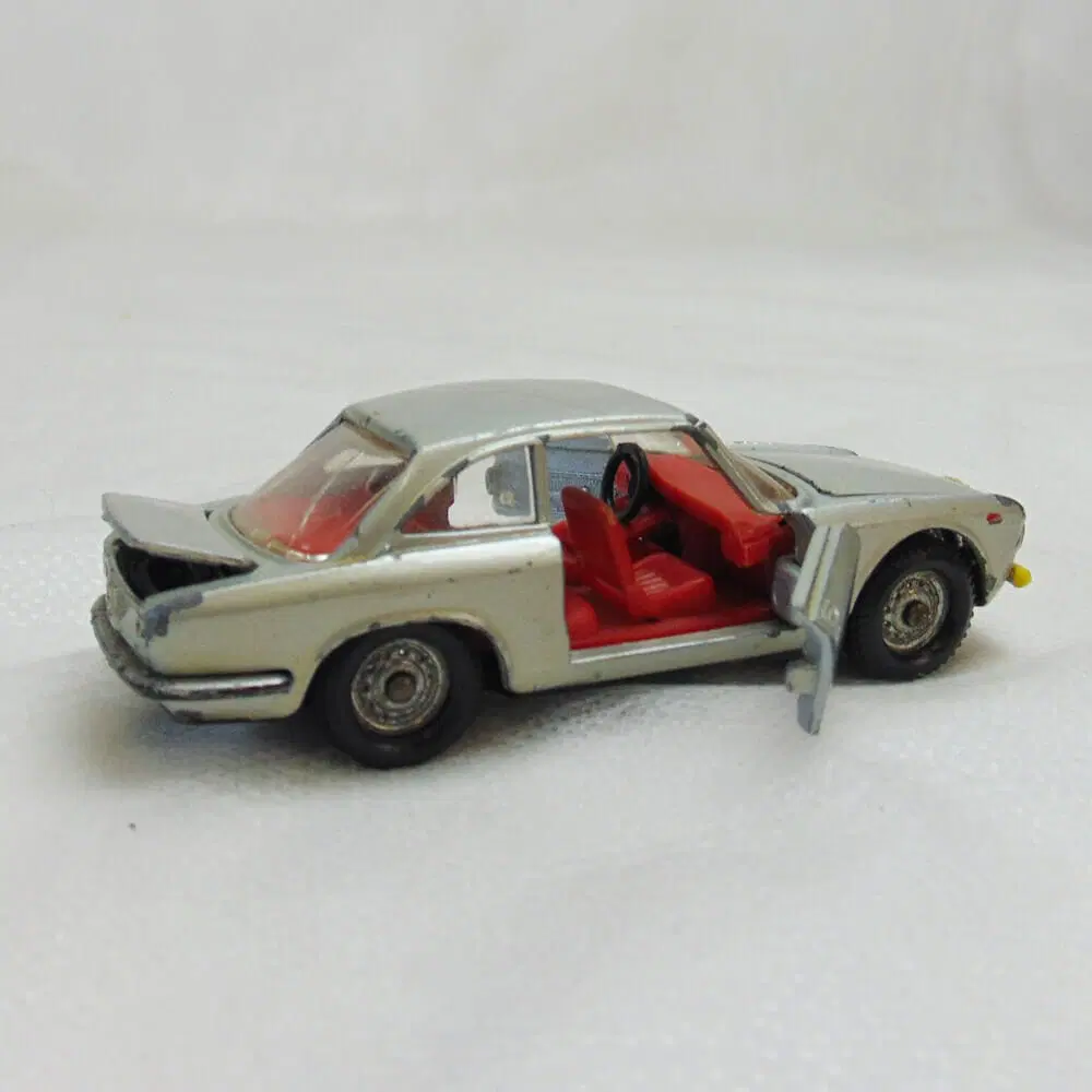 Modellino Alfa Romeo Giulia n.500 realizzato da Politoys e made in Italy. Realizzata in metallo. Come da fotografia, presenta segni di usura su tutta la carrozzeria e piccole crepe del lunotto posteriore. I fari sono intatti nella loro brillantezza, manca solo metà del paraurti anteriore. Interni in ottime condizioni, con sedili reclinabili come da fotografia e nel baule è presenta la ruota di scorta.