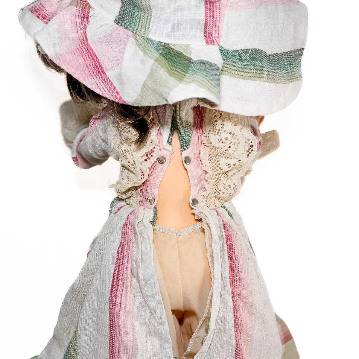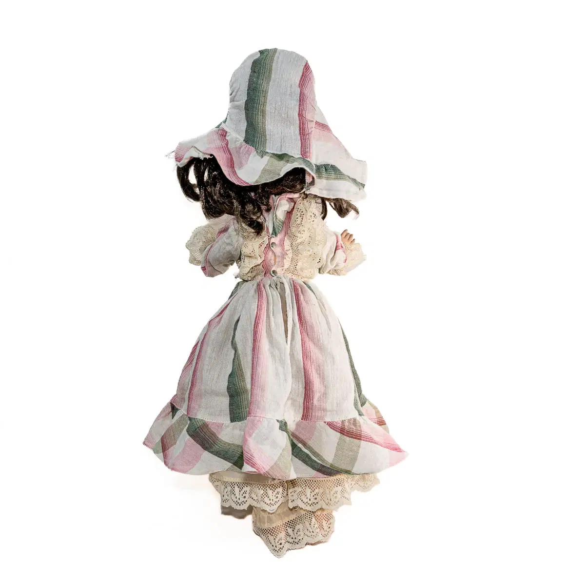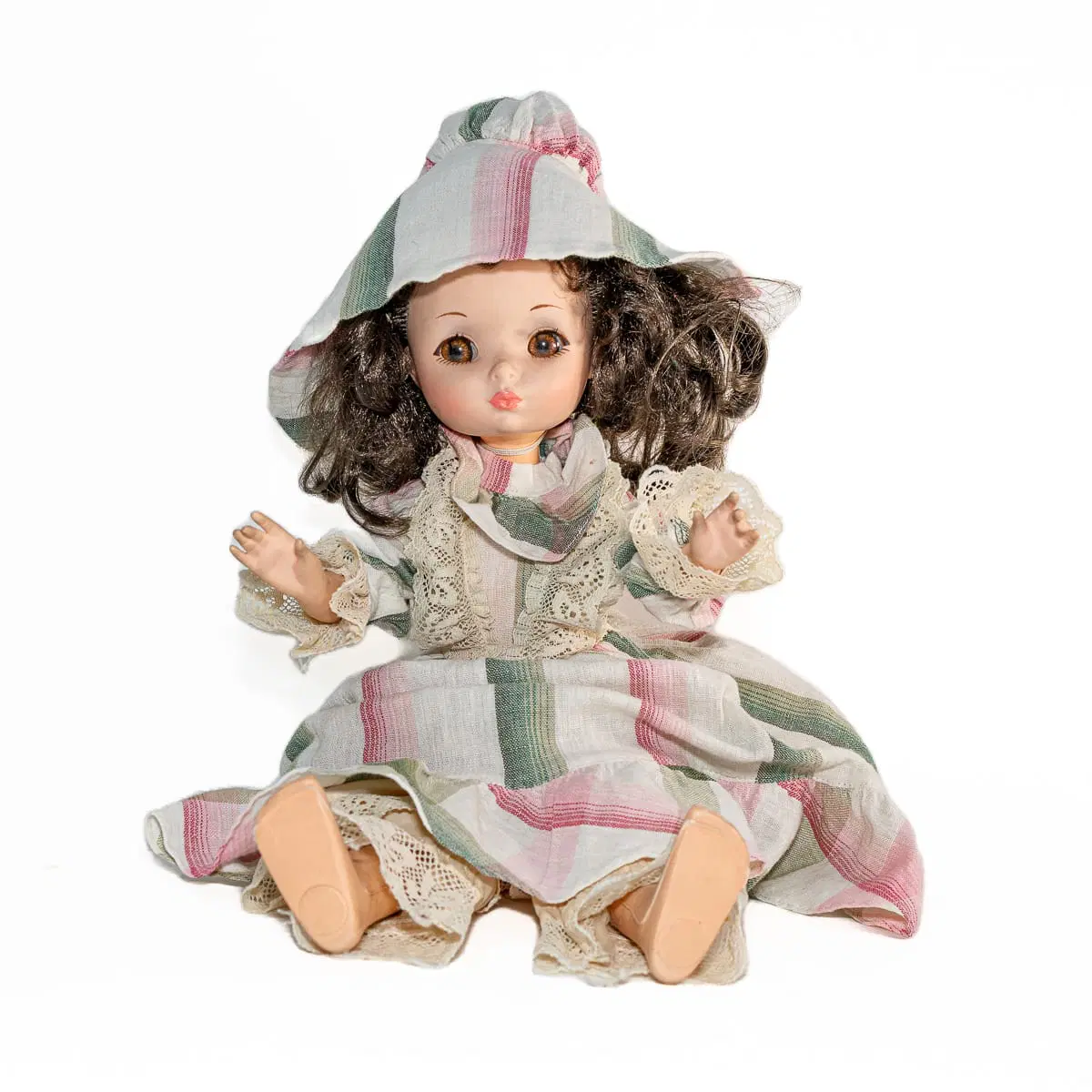 - Condizioni: In ottime condizioni generali, manine e viso sono puliti, capelli leggermente arruffati, il vestito è originale (completo di cappellino abbinato), il retro del vestito è scucito ma senza strappi (riparazione semplice). Mancano le scarpine.