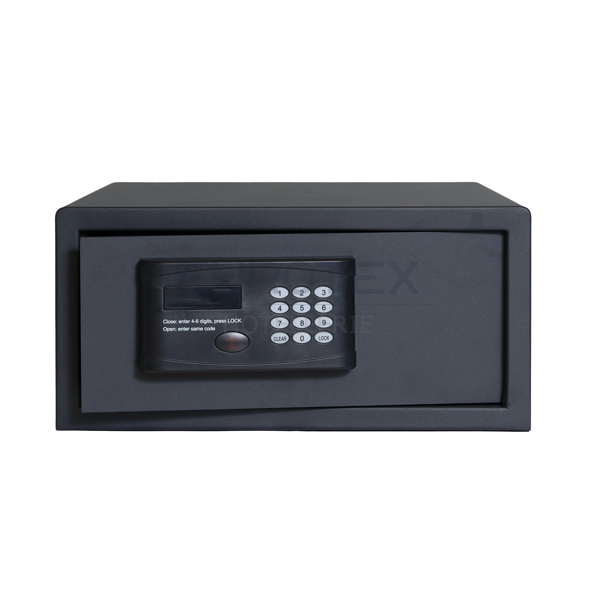 Cassaforte per hotel ad alta sicurezza per proteggere i beni di valore degli ospiti. La cassaforte è realizzata in resistente acciaio ed è dotata di pannello con display a LED