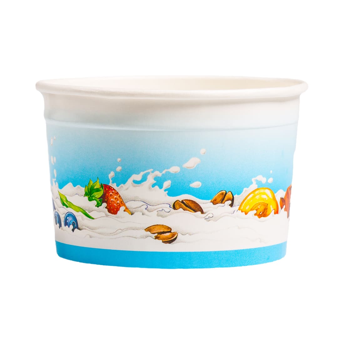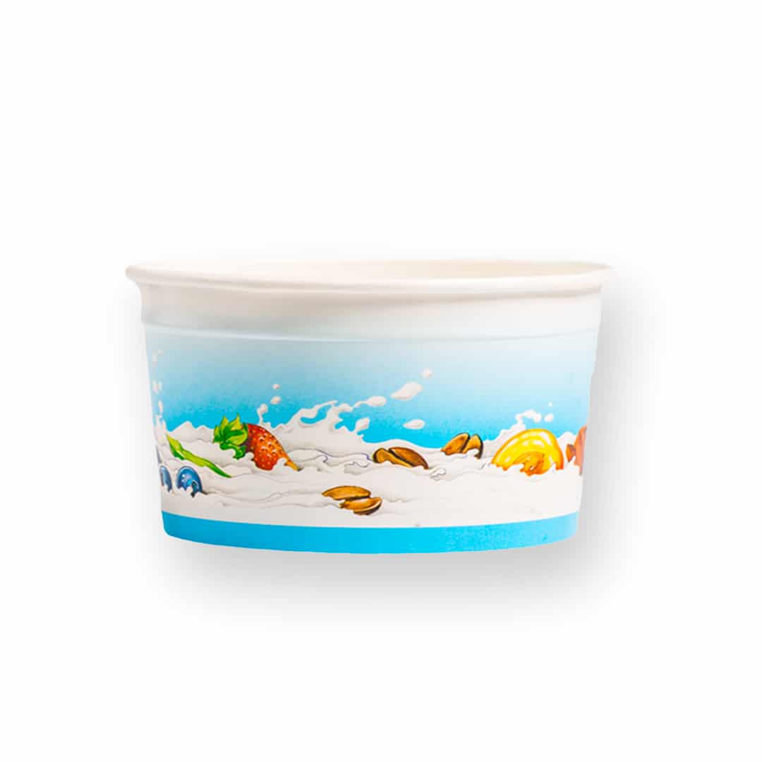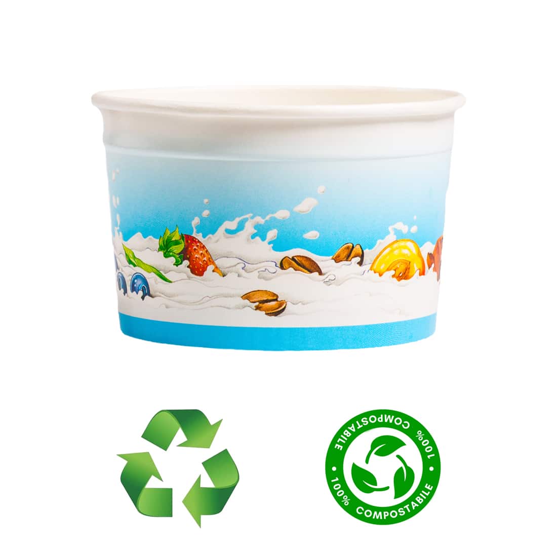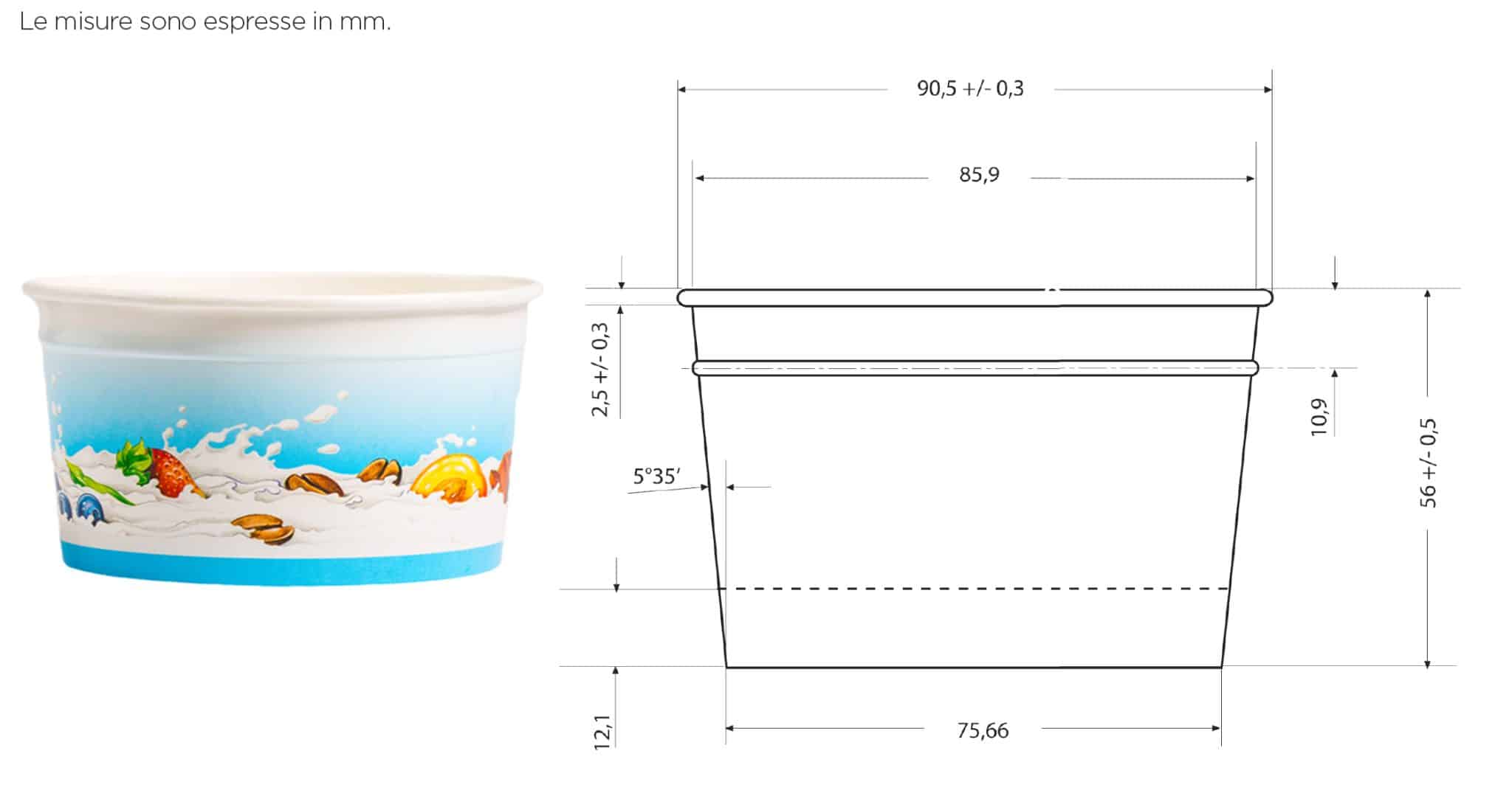 DIMENSIONI: La coppa gelato ha una capacità di 230 cc con un diametro superiore da 90.5 mm, diametro inferiore 75.66 mm e un’altezza 56 mm. Le coppette monouso hanno una fantasia multicolor con latte, frutta e cioccolata e si adattano benissimo a qualsiasi contesto.