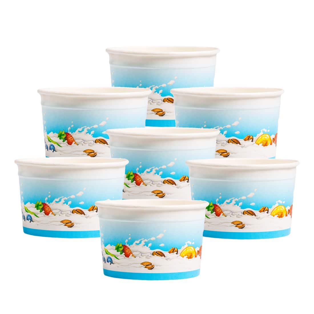 MATERIALI: Le coppette gelato usa e getta sono in cartoncino 100% fibre vergine provenienti da fonti 90% rinnovabili, accoppiato a polietilene. L'interno di ogni coppetta di carta è rivestito con un rivestimento a prova di perdite che è solido e robusto in modo che non goccioli facilmente. Le coppette gelato usa e getta sono progettate per essere resistenti all'olio e all'acqua, garantendo che il gelato rimanga fresco e gustoso senza che la coppetta si ammorbidisca o si rompa.