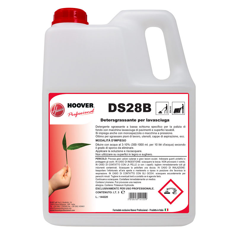 DS28B è infatti un detersgrassante a marchio Hoover Professional studiato per la pulizia di pavimenti fortemente contaminati da sporchi sia di origine minerale che animale e vegetale. Non facendo schiuma, risulta ideale per l’impiego con macchine lavasciuga industriali, da monospazzola a macchine a pressione.