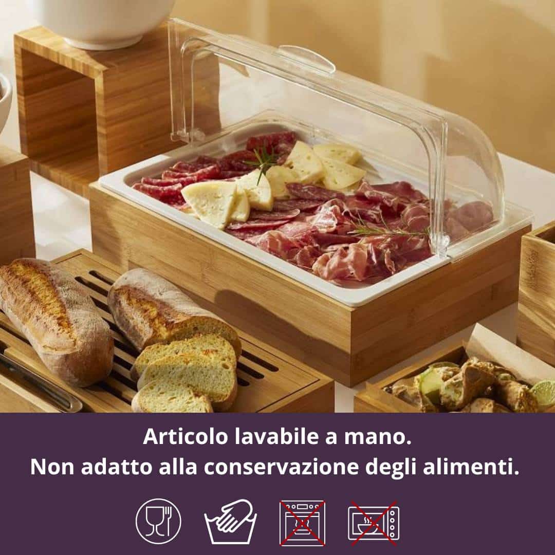 Con il MAQA Espositore Bamboo, aggiungi un elemento di classe naturale alla tua cucina o al tuo tavolo da buffet, creando un ambiente accogliente e invitante che esalta la bellezza dei tuoi prodotti culinari.