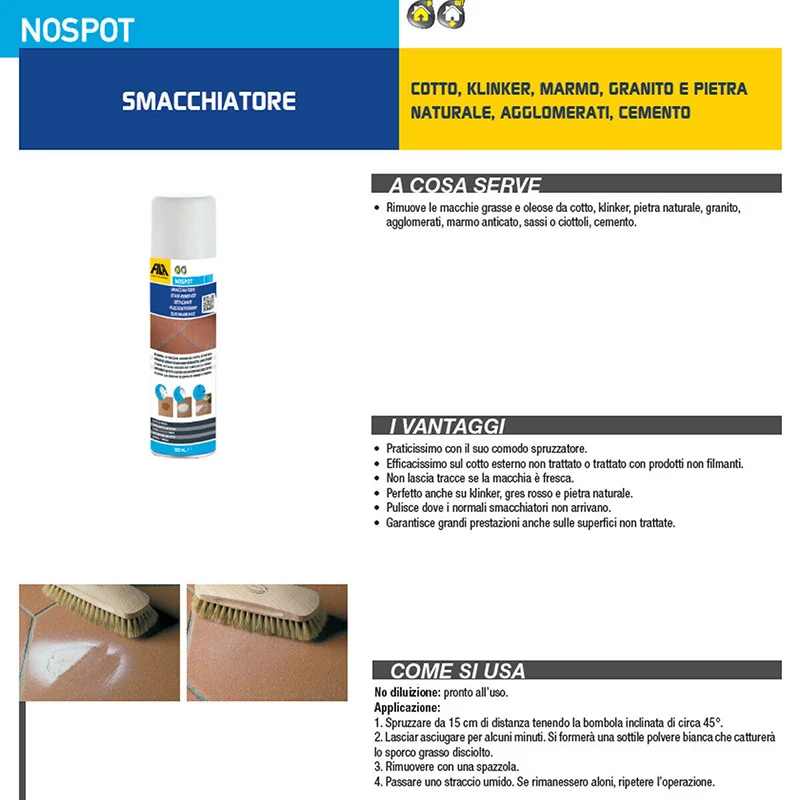 FILANOSPOT Smacchiatore rimuove le macchie grasse e oleose da cotto, klinker e pietra naturale, granito, agglomerati, marmo anticato, sassi o ciottoli, cemento. Efficacissimo sul cotto esterno non trattato o trattato con prodotti non filmanti. Garantisce grandi prestazioni anche sulle superfici non trattate.