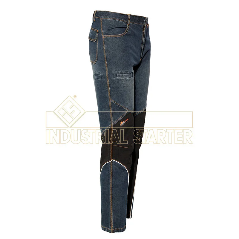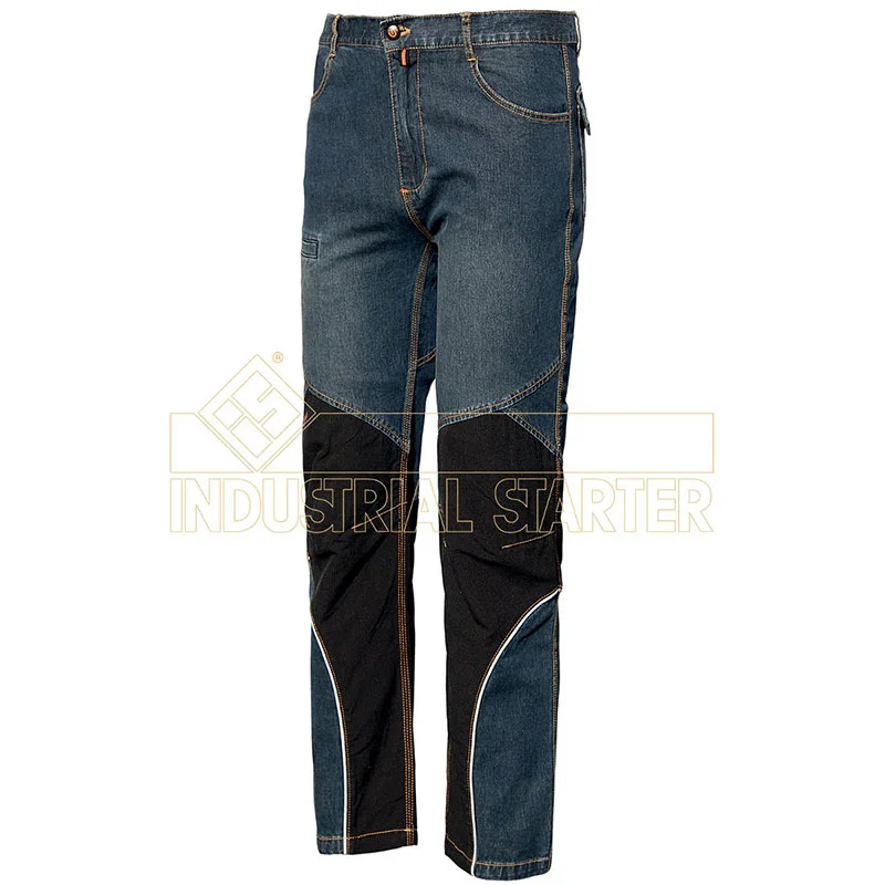 CE CAT. I – EN ISO 13688:2013 Jeans dal taglio sportivo con rinforzi in tessuto simil cordura anti abrasione che, assieme al rinforzo posteriore, accentua la robustezza. Dotato di 4 tasche, più una tasca porta cellulare, una porta metro, entrambe a scomparsa. Composizione: cotone 98% spandex 2% , peso 280 g/m2 (prima lavaggio) Taglie: M-L-XL-XXL. Colore: blu