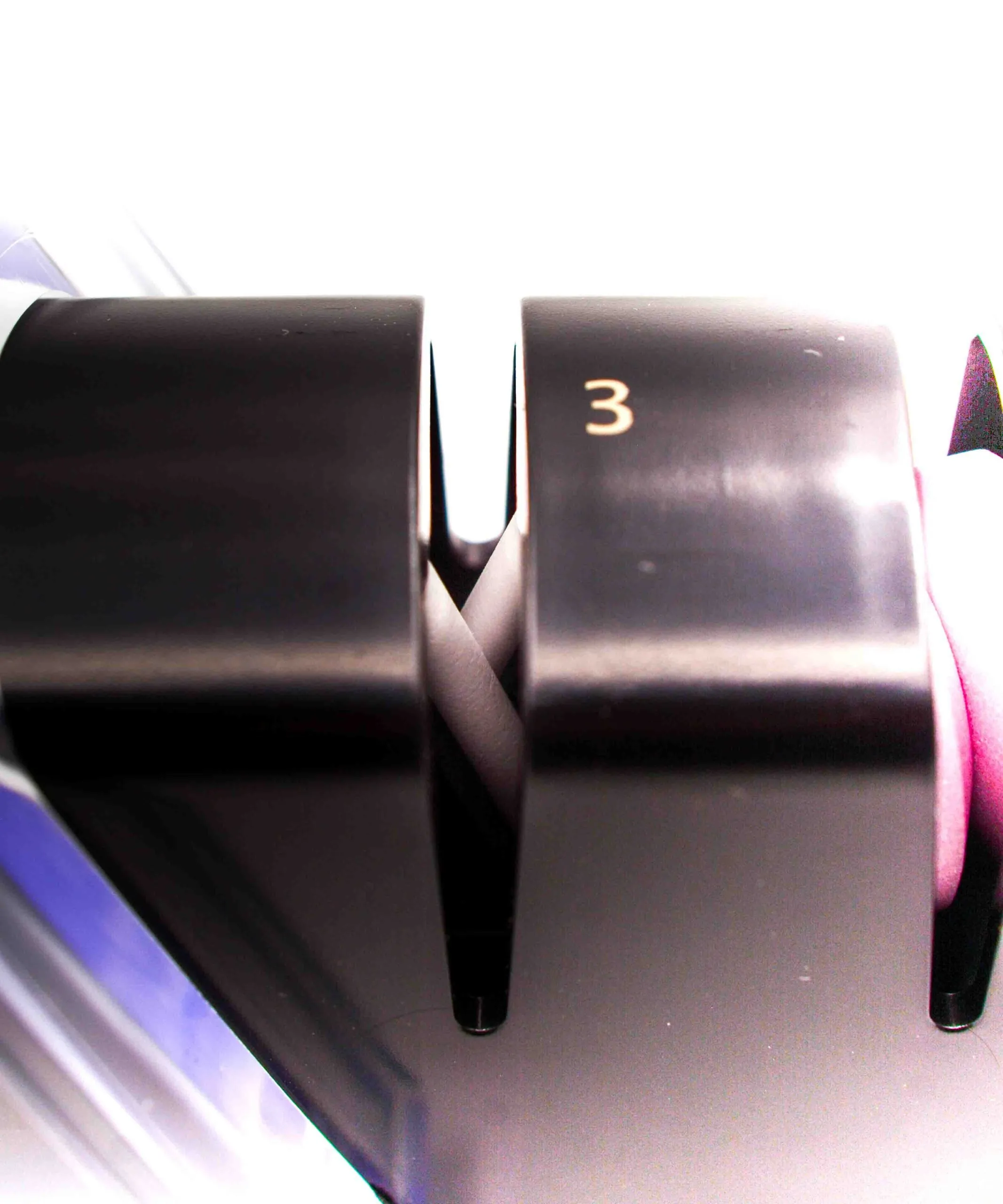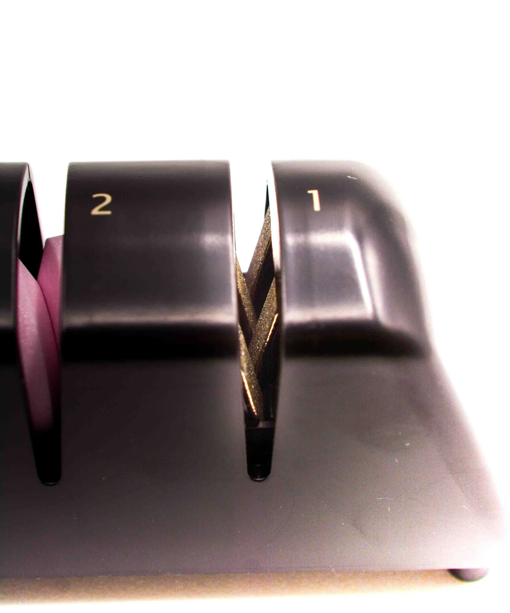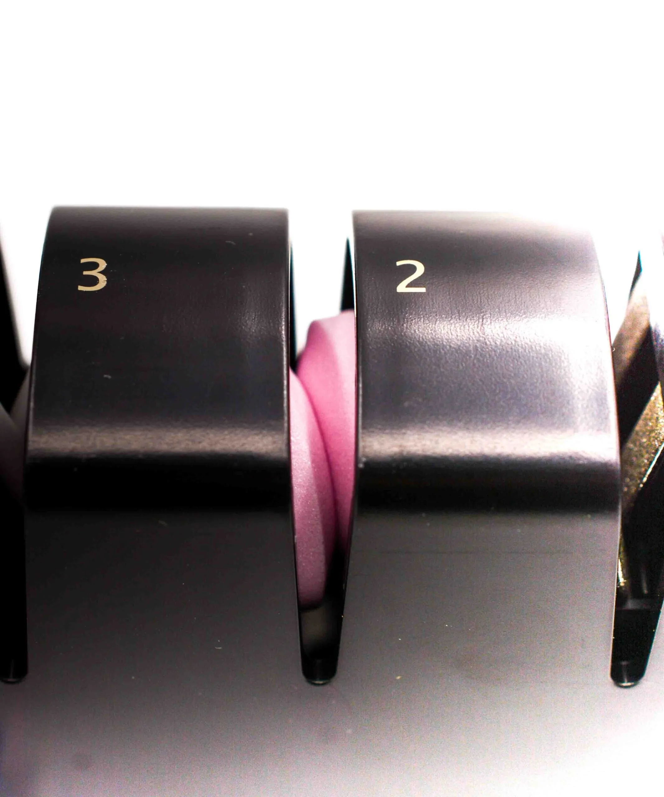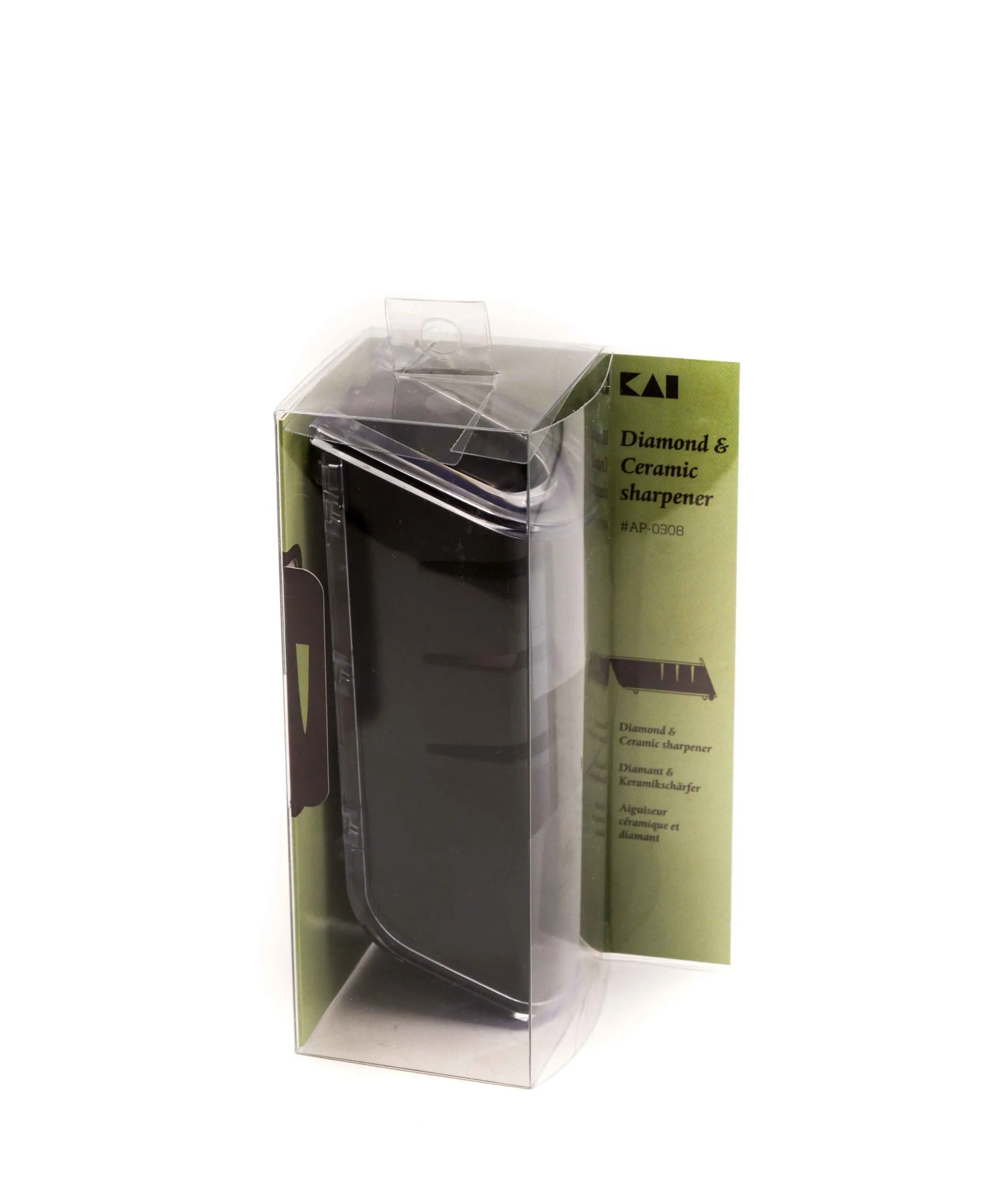 Kai Affilacoltelli 3 Grane Simmetrico ha la tripla grana, una in in carta vetrata a grana grosso per sgrossare, la seconda in pietra e la terza in ceramica così da rendere il filo perfetto e tagliente