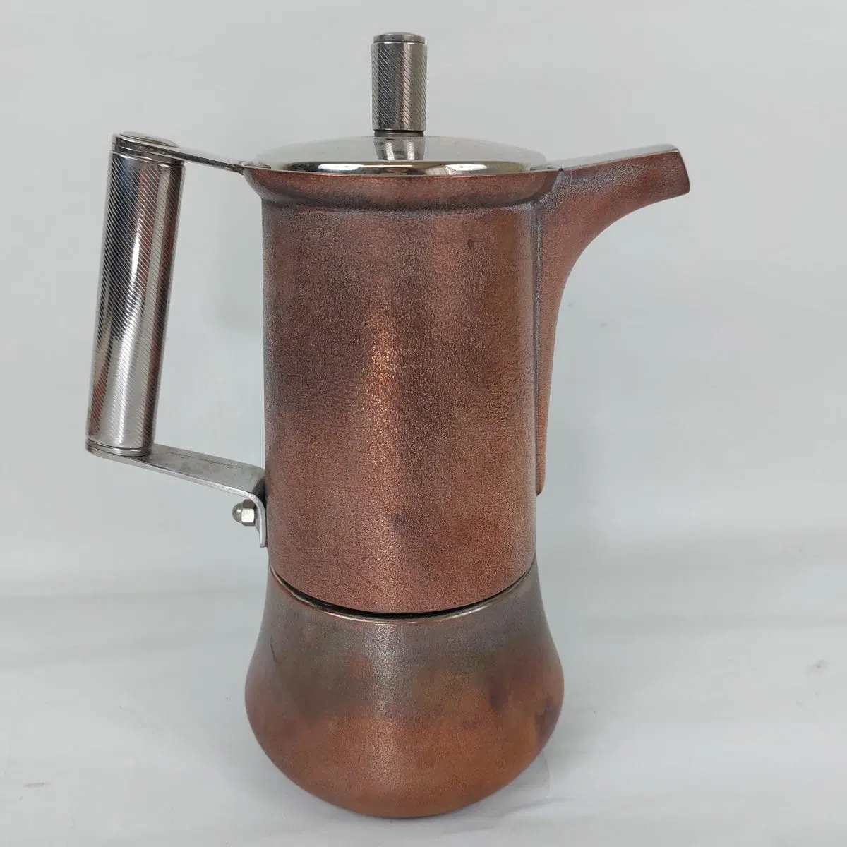 Moka per caffè espresso dal design di Serafino Zani della linea Genesis, colore rame e manico lavorato a spirale. Bellissima e in buone condizioni, la capienza è di circa 3-4 tazze. Ottima per chi desidera un oggetto unico nella propria cucina! Valutazione corrente di mercato 290€