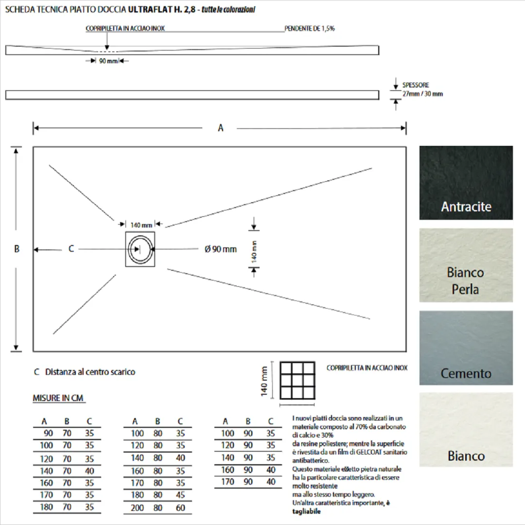 I nuovi piatti doccia sono realizzati in un materiale composto al 70% da corbonato di calcio e 30% da resine poliestere; mentre la superficie è rivestita da un film di GELCOAT sanitario antibatterico. Questo materiale effetto pietra naturale ha la particolare caratteristica di essere molto resistente ma allo stesso tempo leggero. Un’altra caratteristica importante è tagliabile.