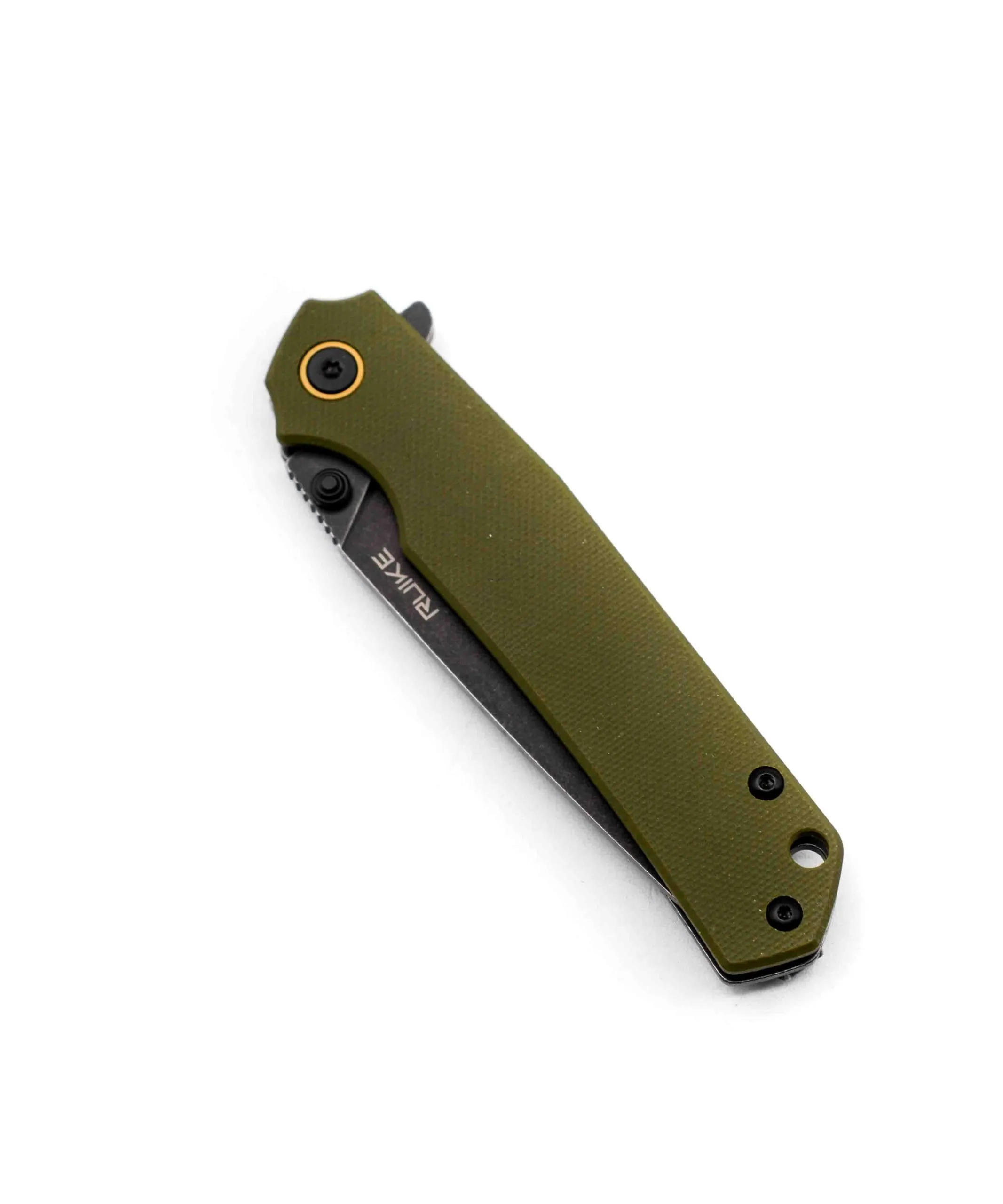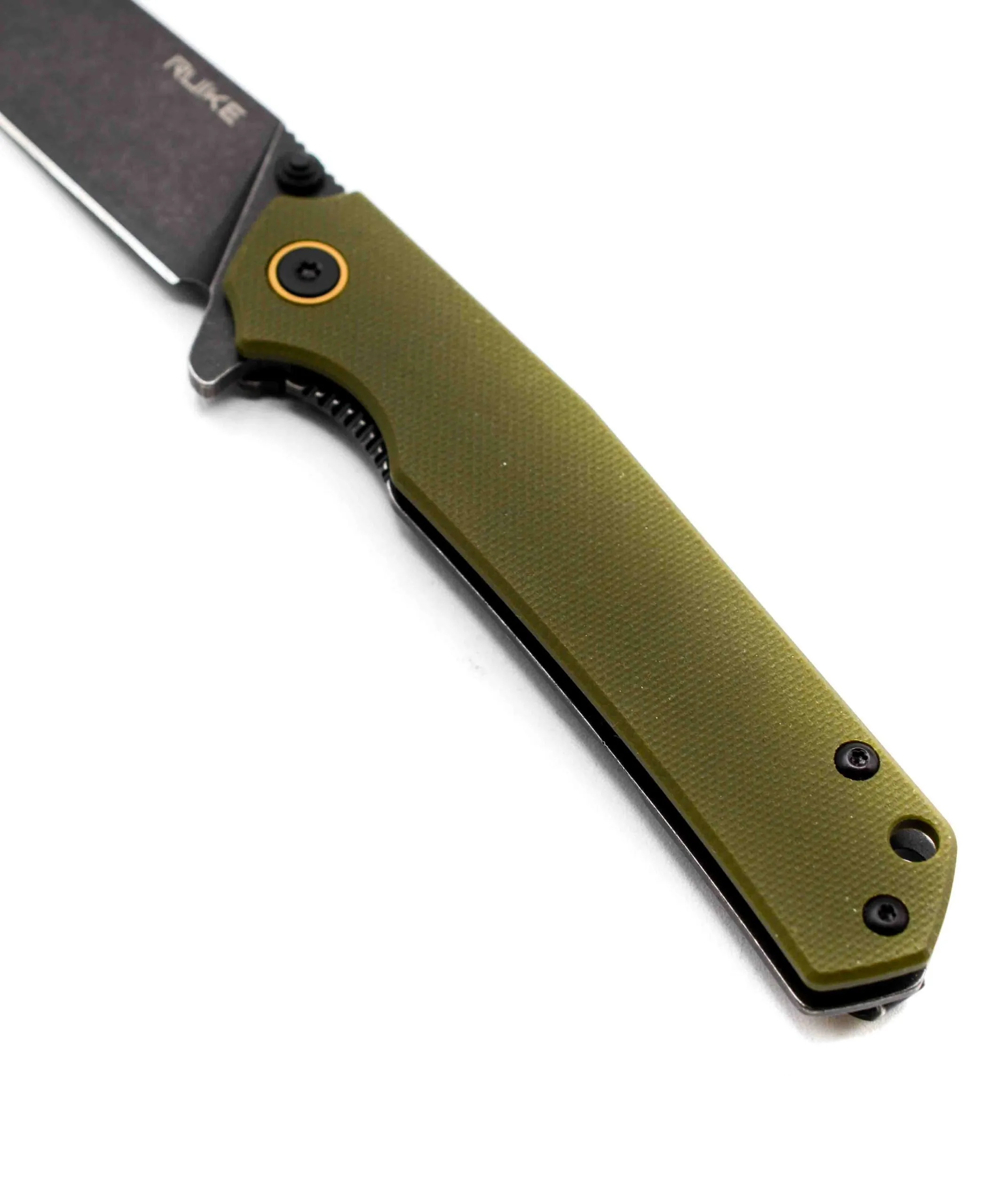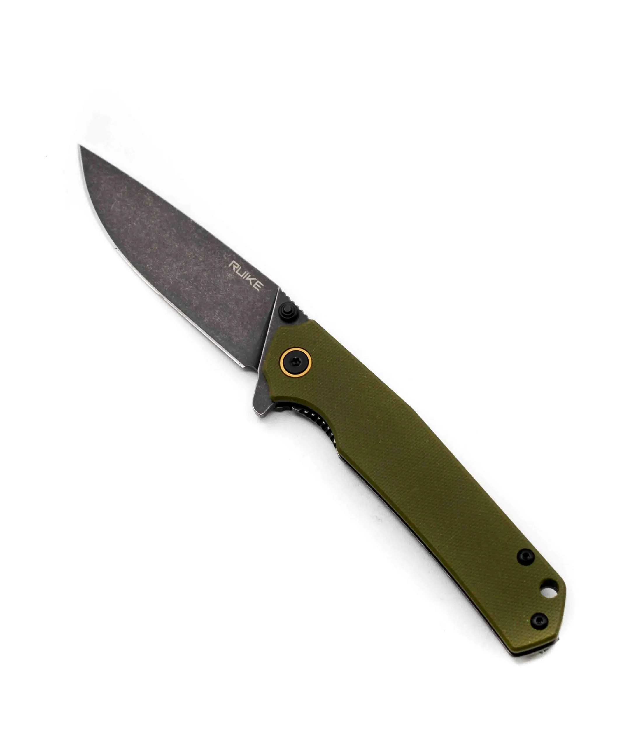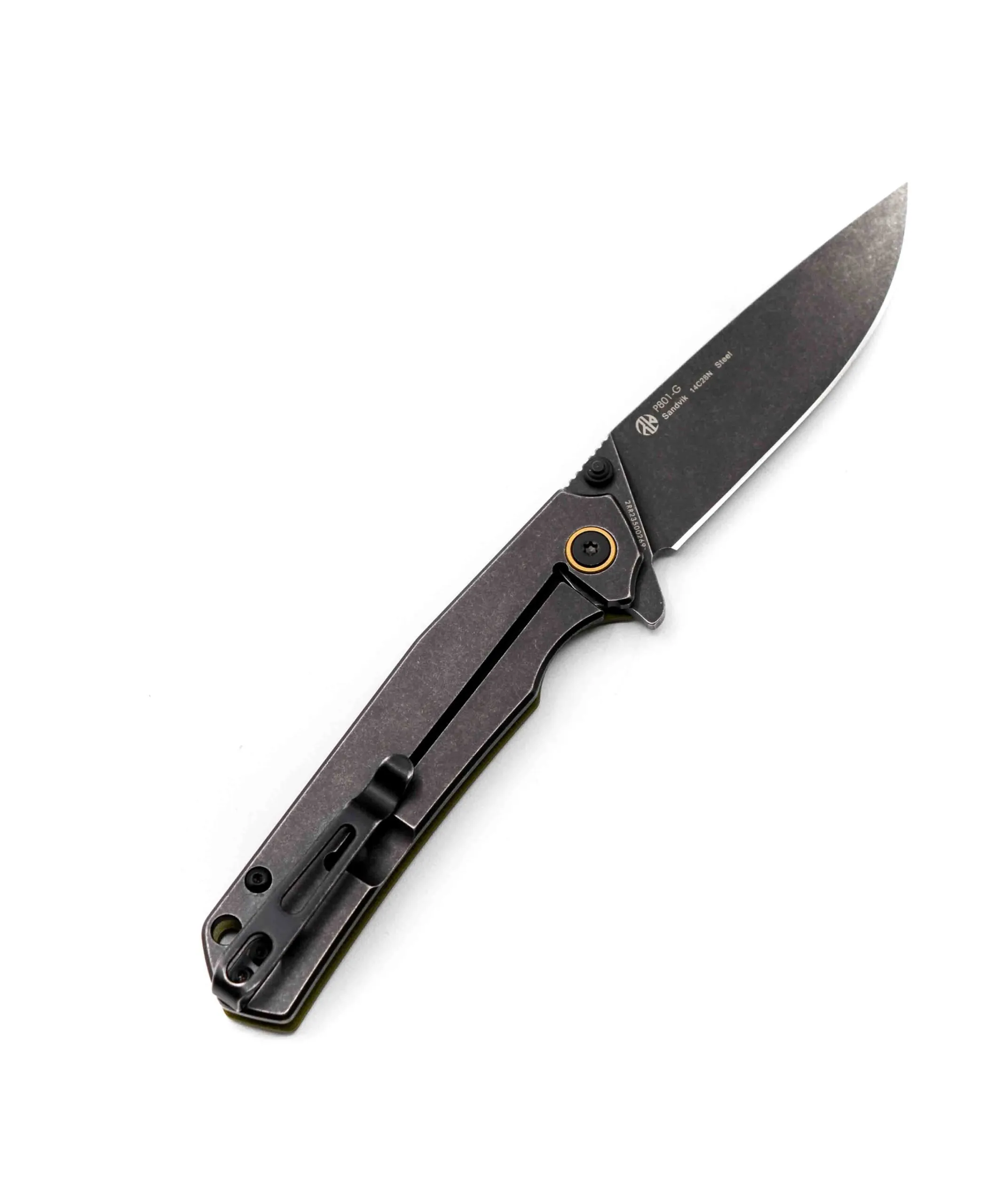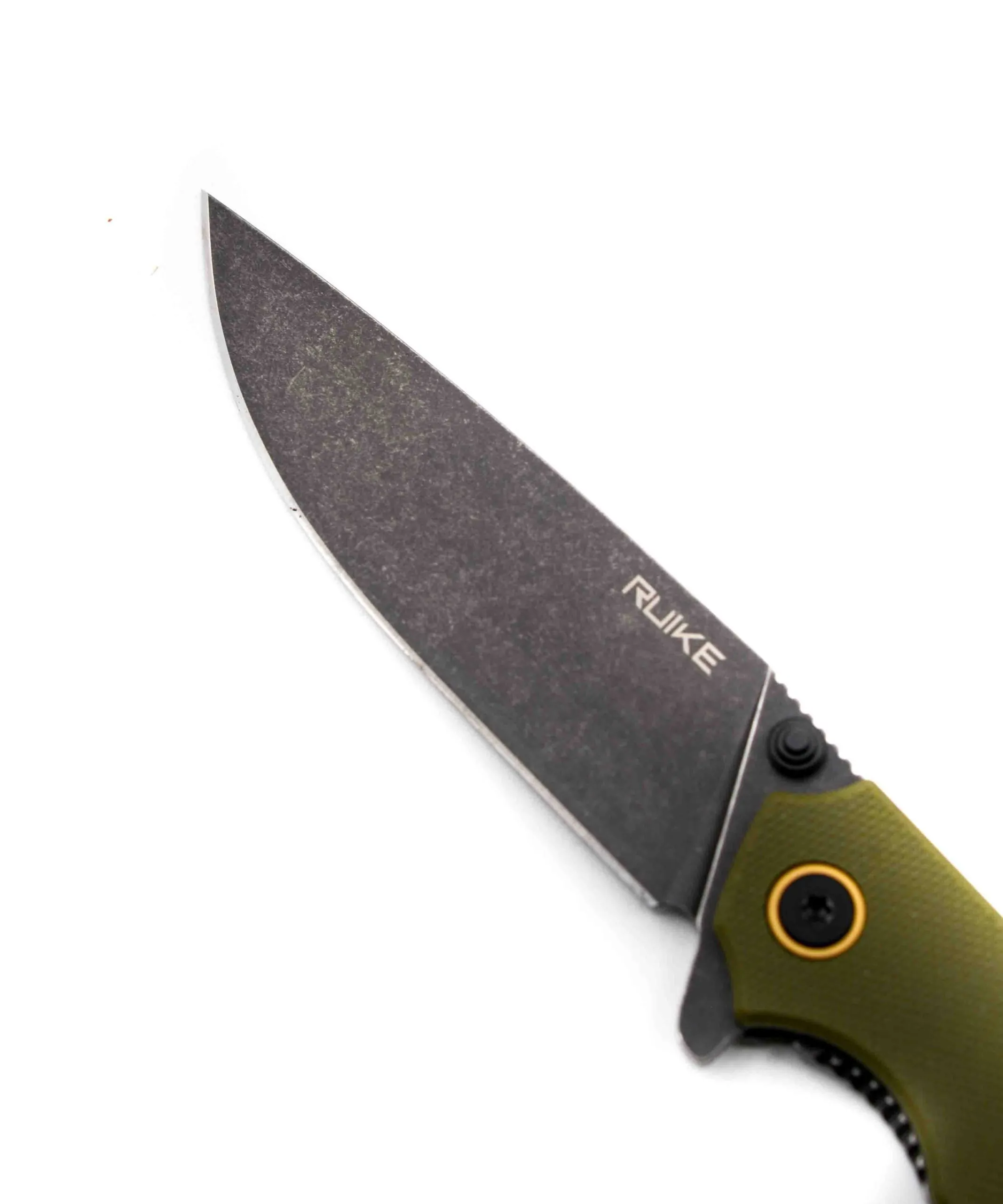 Ruike P801 Green modello in acciaio inox, con manico nero in G10 verde e clip sul retro per portarlo sempre con te