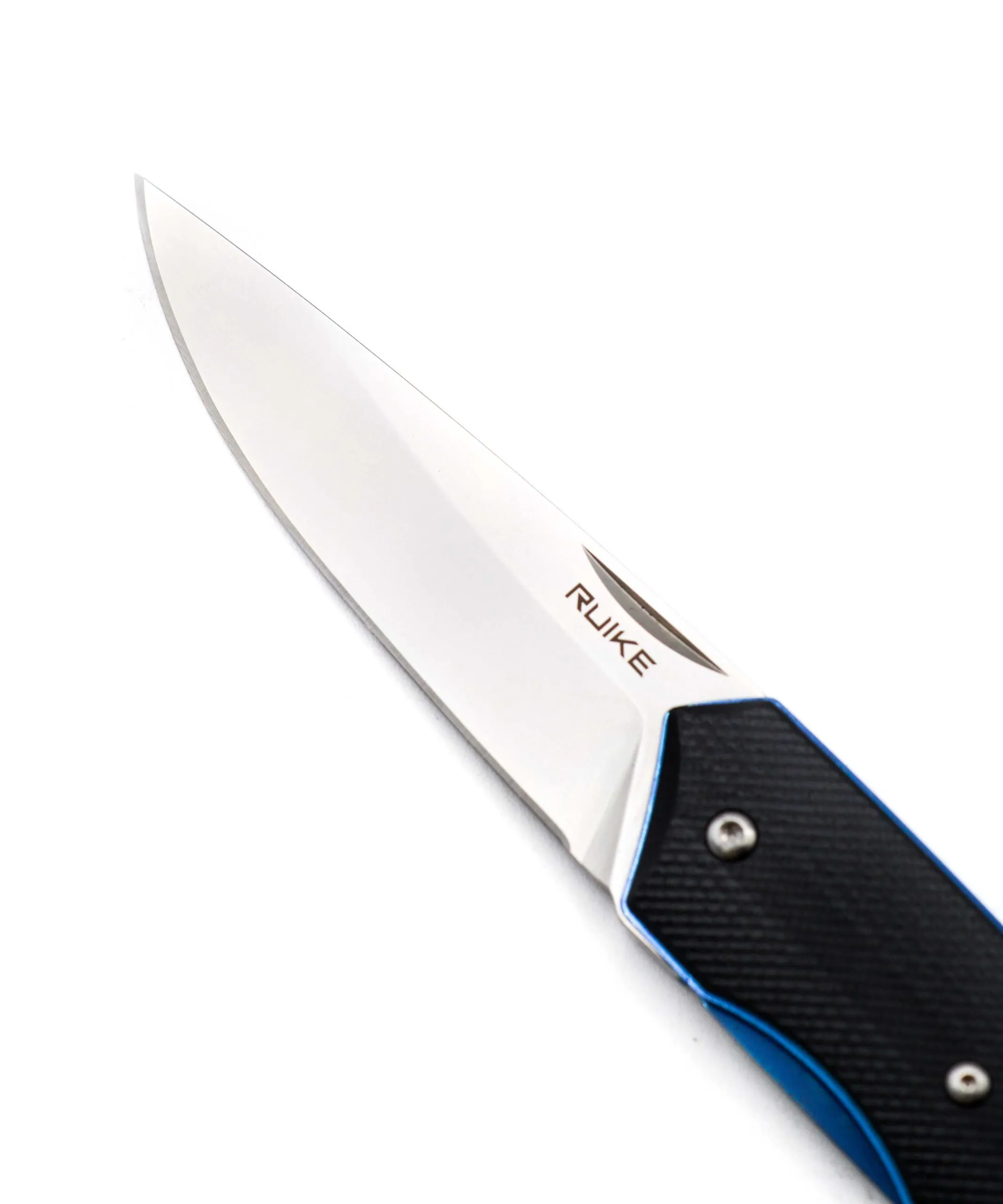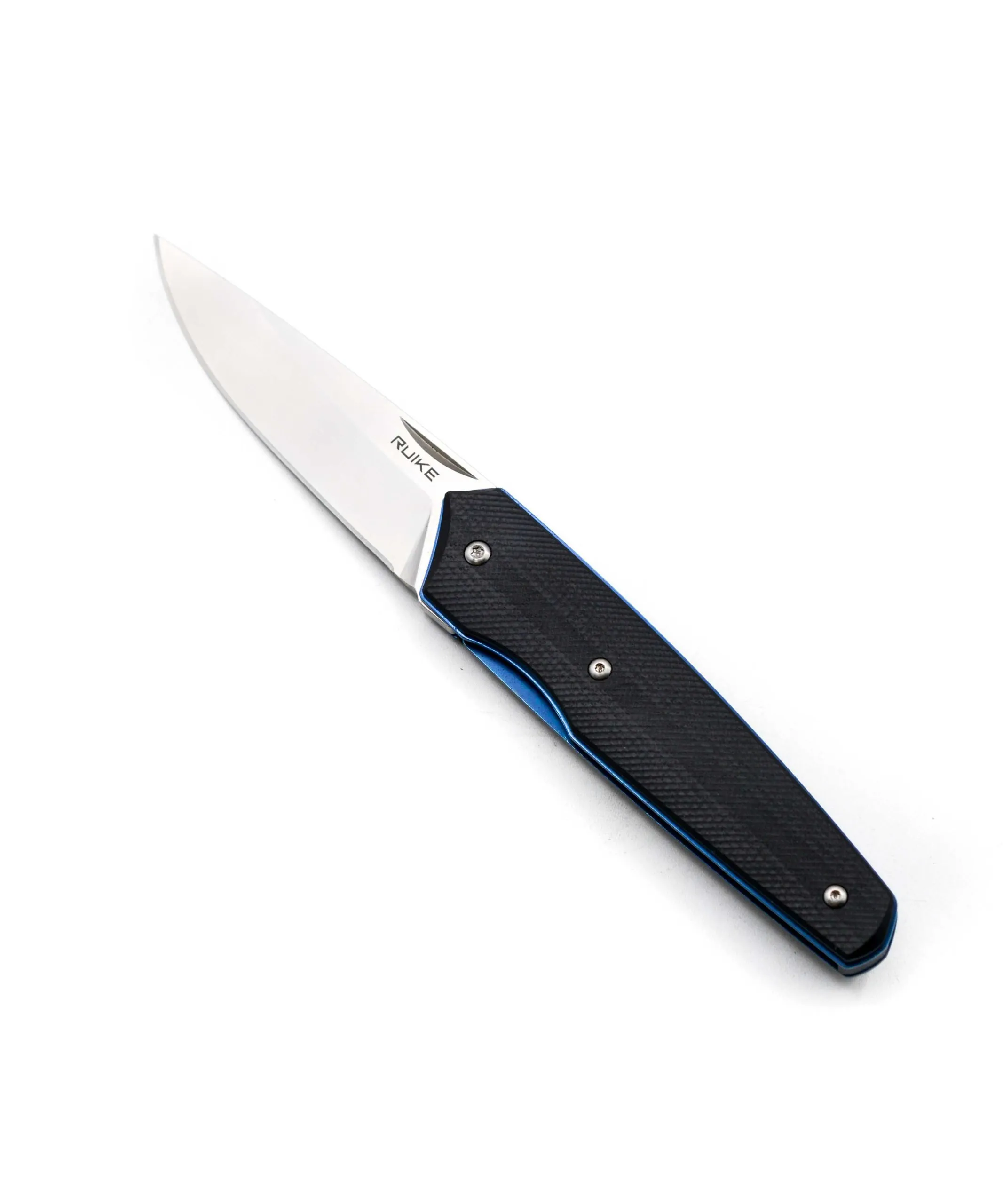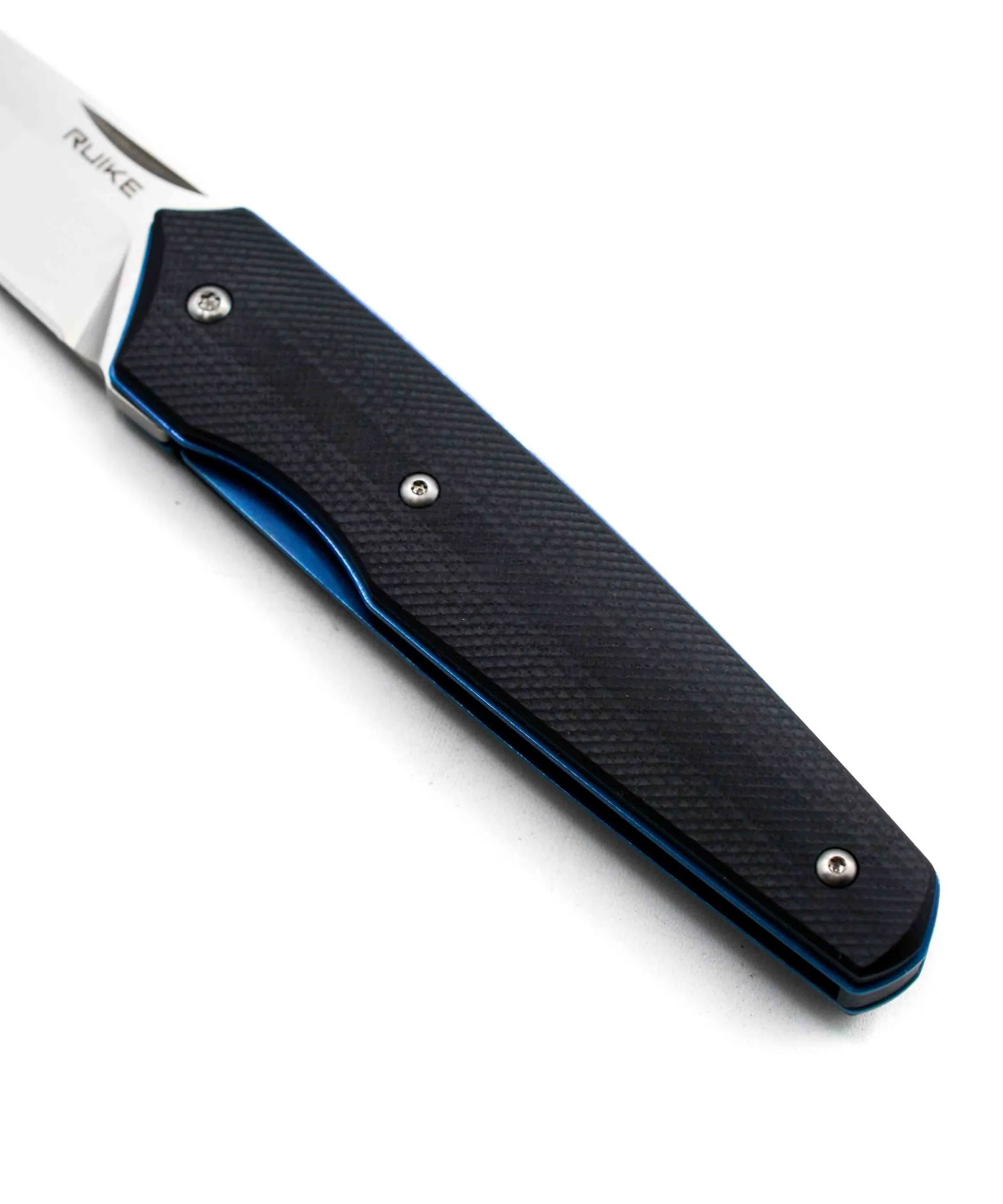 Ruike P848 Black modello in acciaio inox, con manico nero in G10 e una lamella di alluminio anodizzato blu che lo rende molto elegante
