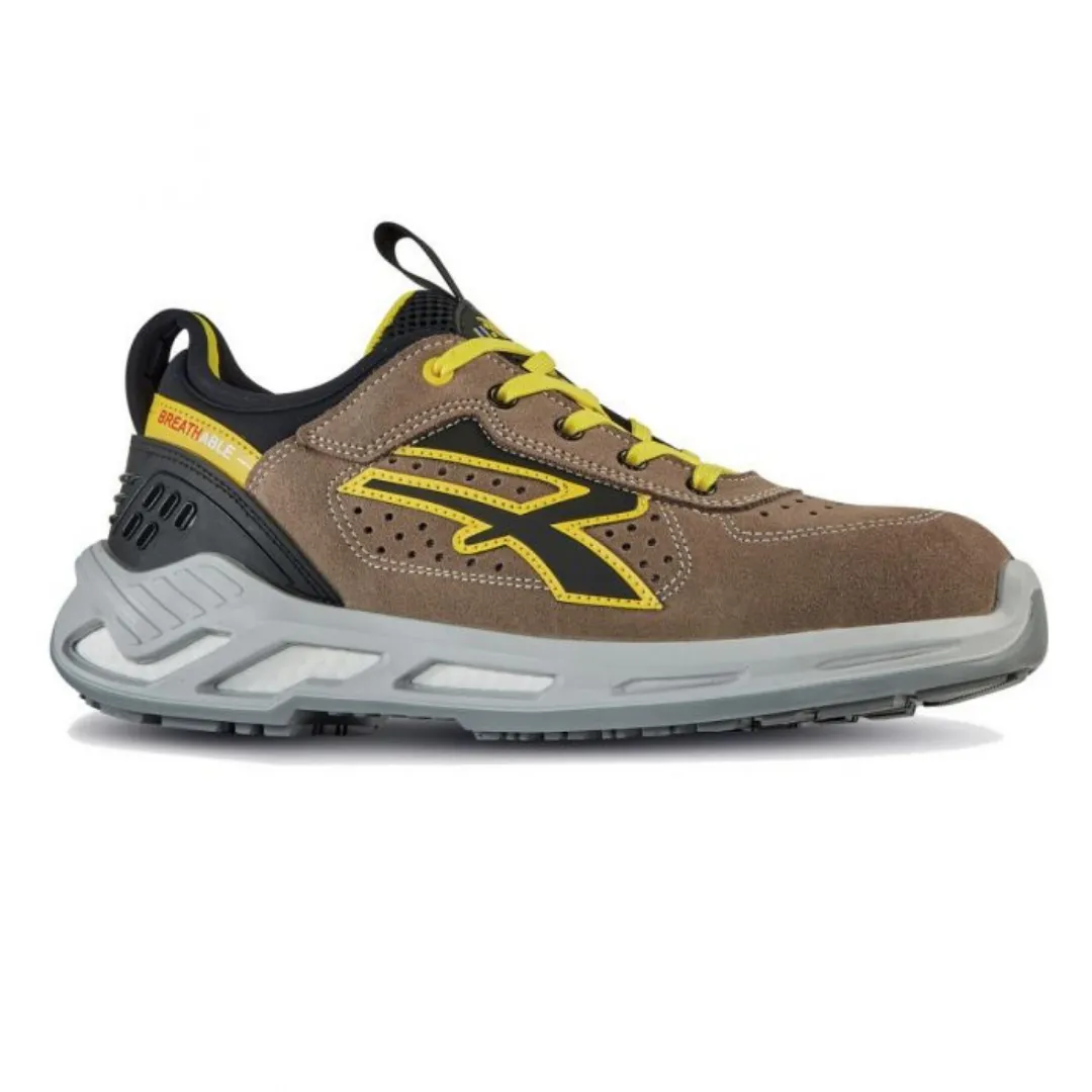 Scarpe antinfortunistiche basse, leggere e comode U-Power della linea Red 360, con tomaia in morbida pelle scamosciata forata, collarino con tessuto in fibra Lycra® e tallonetta anti-shock, puntale in alluminio, antiperforazione, antiscivolo e suola PU/PU infinergy, S1P SRC ESD