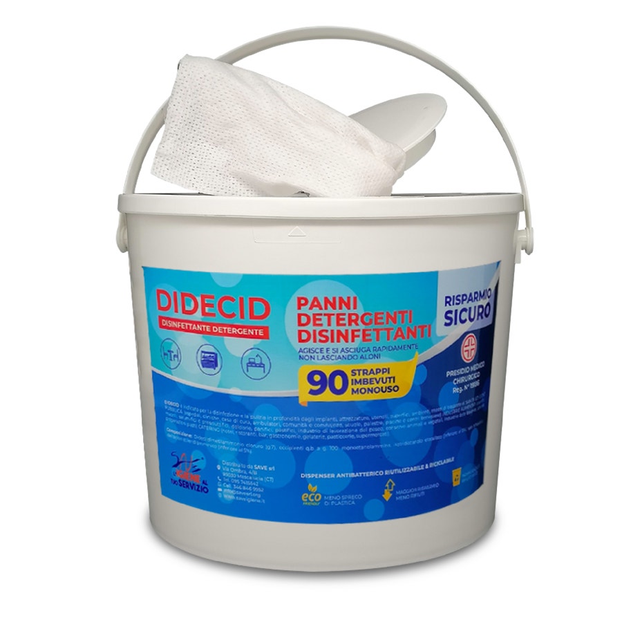 Il secchiello Didecid è predisposto per ospitare il rotolo di carta e il detergente liquido sanificante. Una volta imbevuto, trattandosi di un rotolo a strappi, ogni singolo foglio potrà essere utilizzato per ultimare le pulizie della giornata. Si tratta di uno strumento pratico e comodo, che agevola la sanificazione degli ambienti e velocizza le tempistiche richieste. Si tratta di un vero e proprio dispenser antibatterico riutilizzabile e riciclabile che ti permetterà di ottenere 90 strappi imbevuti monouso.