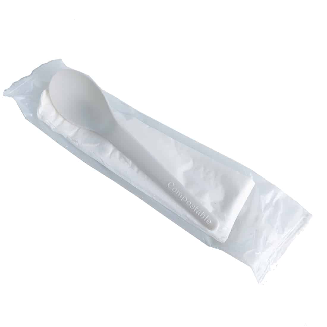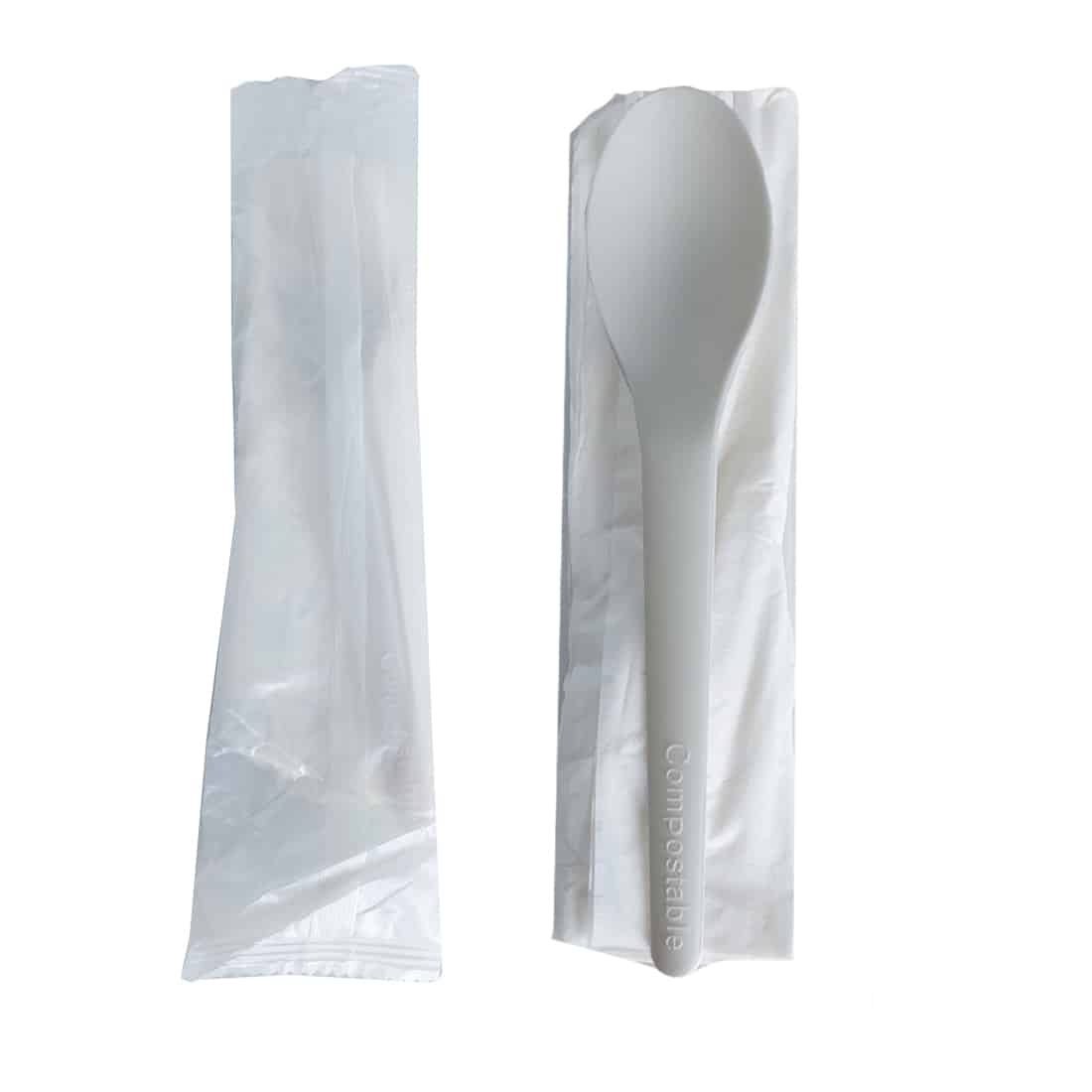 DIMENSIONI: Il cucchiaio hanno una lunghezza di 15.5 cm e peso di 5 gr, un tovagliolo con misura 33×33 cm a 2 veli. Il tutto 100 % biodegradabili e compostabili. Il prodotto, dal design semplice ed elegante, è ideale per il cibo sia freddo che caldo. Ciascun kit singolarmente confezionato contiene un cucchiaio monouso e un tovagliolo piegato.