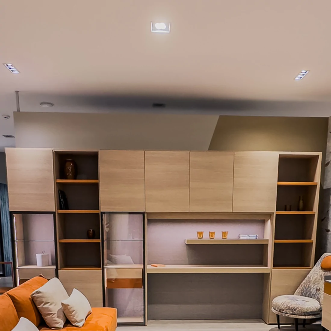 SOGGIORNO SPALLA TOMASELLA CON ELEMENTO SCRIVANIA E VETRINE CON ILLUMINAZIONE