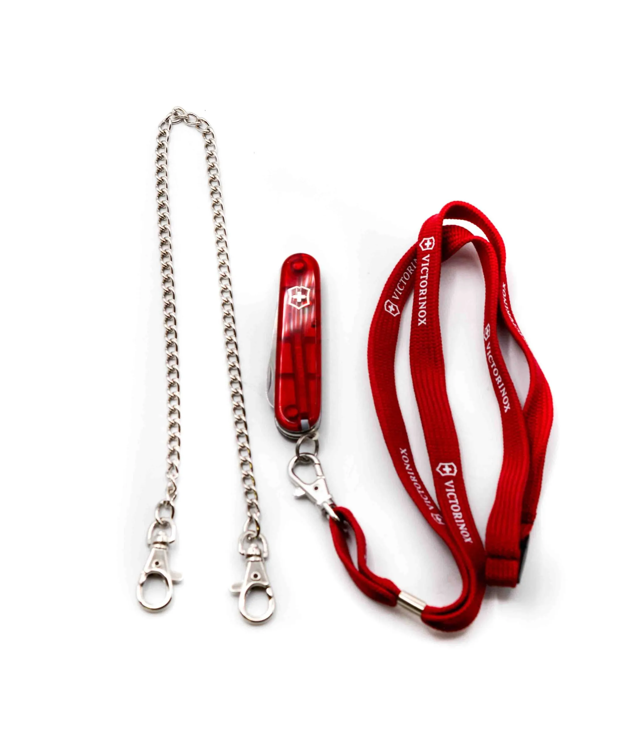 oltre ai classici accessori come il seghetto, lo stuzzicadenti e la pinzetta, in questo modello sono presenti anche una catena con due moschettoni così si può attaccare ai pantalonisenza perderlo oppure una collanina